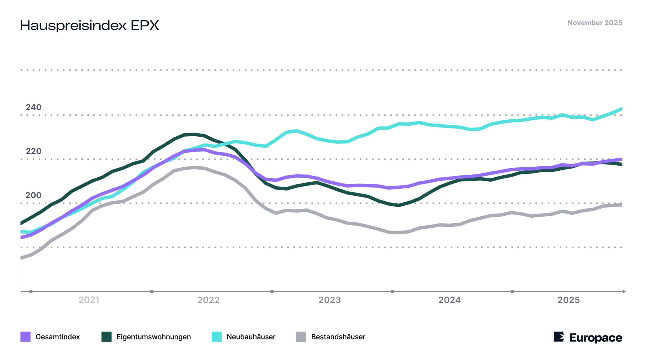 Berlin, 09. Dezember 2025 – Der Europace Hauspreisindex (EPX) verzeichnet im November einen leichten Aufschwung der Immobilienpreise in fast allen Segmenten und setzt damit die Entwicklung aus dem Vormonat Oktober fort. Im November hebt sich das Segment der neuen Ein- und Zweifamilienhäuser mit einem Plus von knapp 0,8 Prozent deutlich hervor.