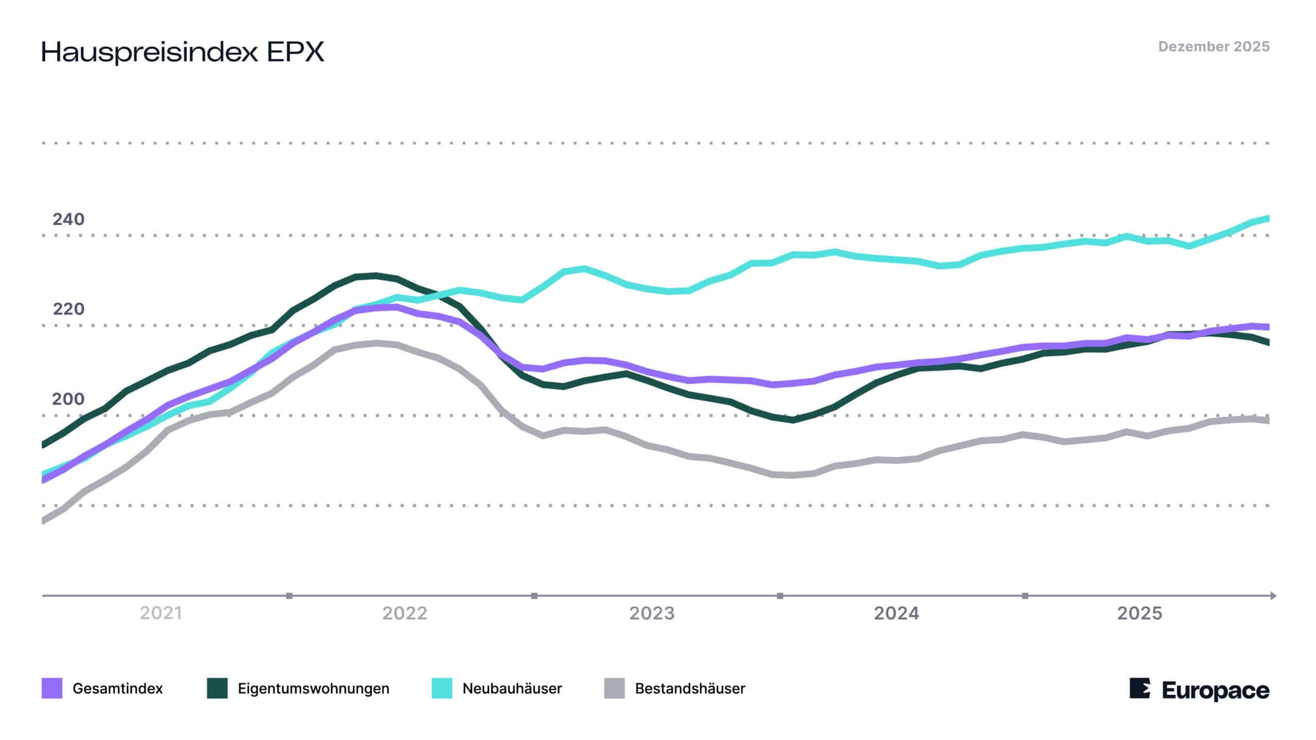 Die Methodik des EPX hedonic wurde mit Hilfe eines in Zusammenarbeit mit Finpolconsult entwickelten statistischen Verfahrens ermittelt. Ziel dieser hedonischen Regressionsanalyse ist es, den reinen Preiseffekt pro betrachteter Periode herauszustellen. Der Gesamtindex besteht aus den Daten der Einzelindizes für Bestands- und Neubauhäuser sowie für Eigentumswohnungen. Alle Daten ab 2005 können über das Plus im Kasten hierunter abgerufen und unter Nennung von Europace als Quelle kostenfrei genutzt werden.